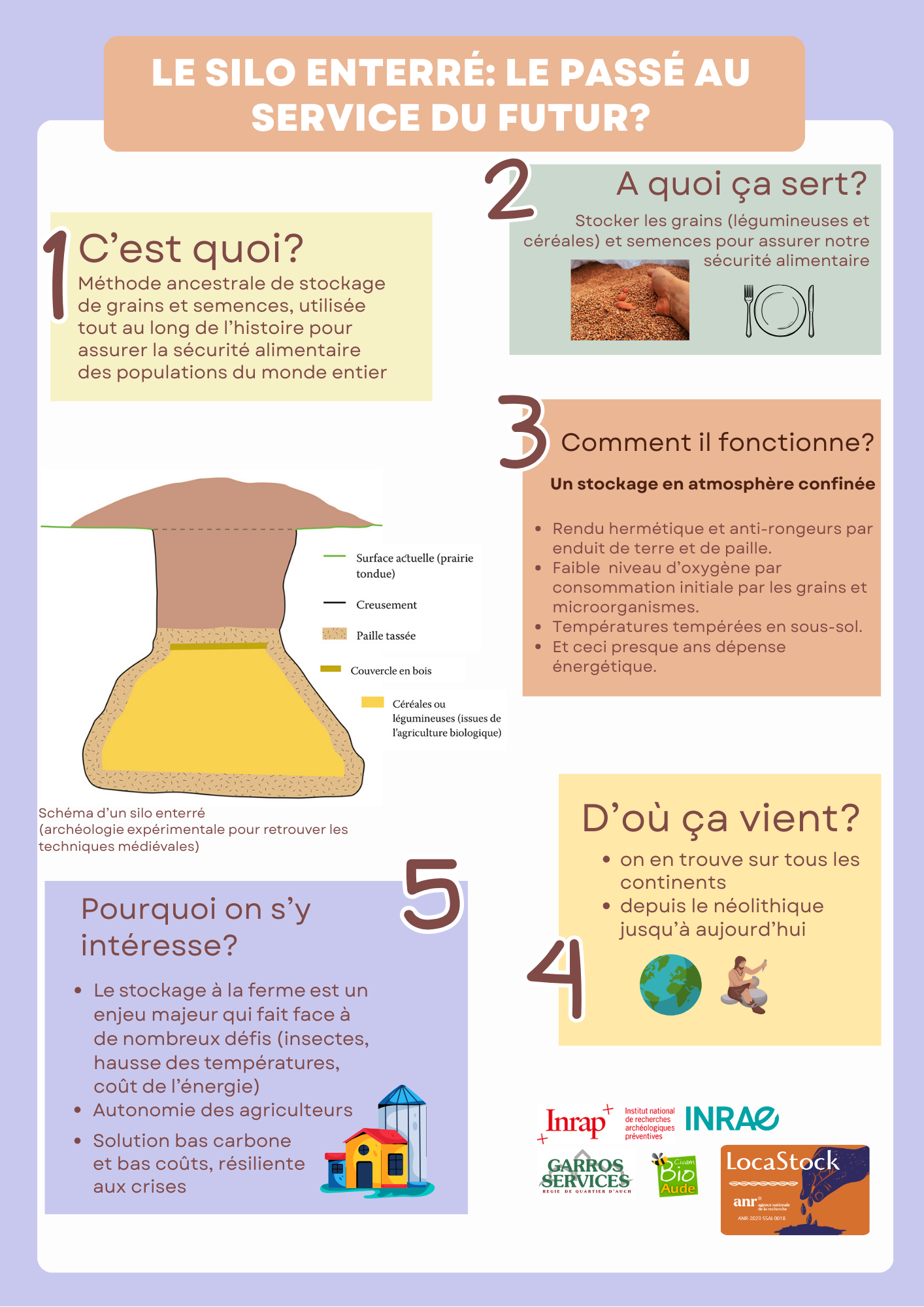 Le projet LocaStock ANR-2023-SSAI-0018 se donne pour objectif d’imaginer et d’expérimenter un stockage résilient des productions agricoles et alimentaires dans des conditions propres, saines, loyales, économes, sans impact sur l’environnement et adaptées au contexte actuel, ainsi qu’à définir dans quelle mesure les techniques ancestrales peuvent contribuer à apporter des réponses aux enjeux du présent et du futur. Dans cette optique, il est proposé de restituer et remettre au goût du jour le stockage en silo enterré pratiqué par nos ancêtres.Les actions