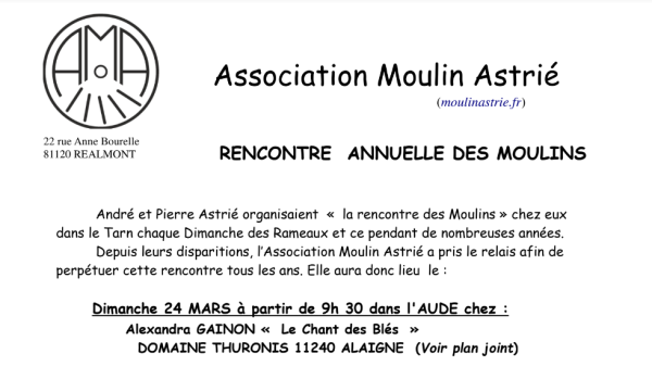 André et Pierre Astrié organisaient « la rencontre des Moulins » chez eux dans le Tarn chaque Dimanche des Rameaux et ce pendant de nombreuses années.